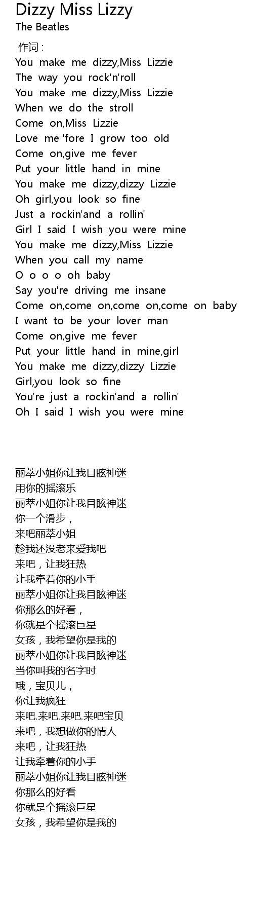 | [00:59.34] | You make me dizzy,Miss Lizzie |