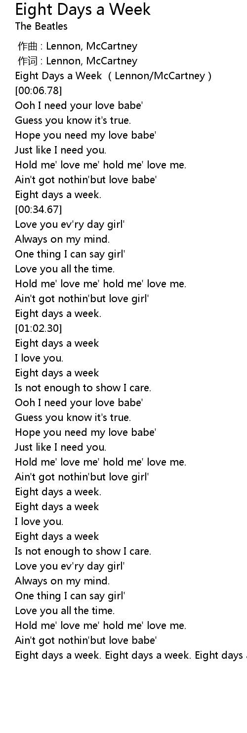 | [02:23.74] | Eight days a week. Eight days a week. Eight days a week. |