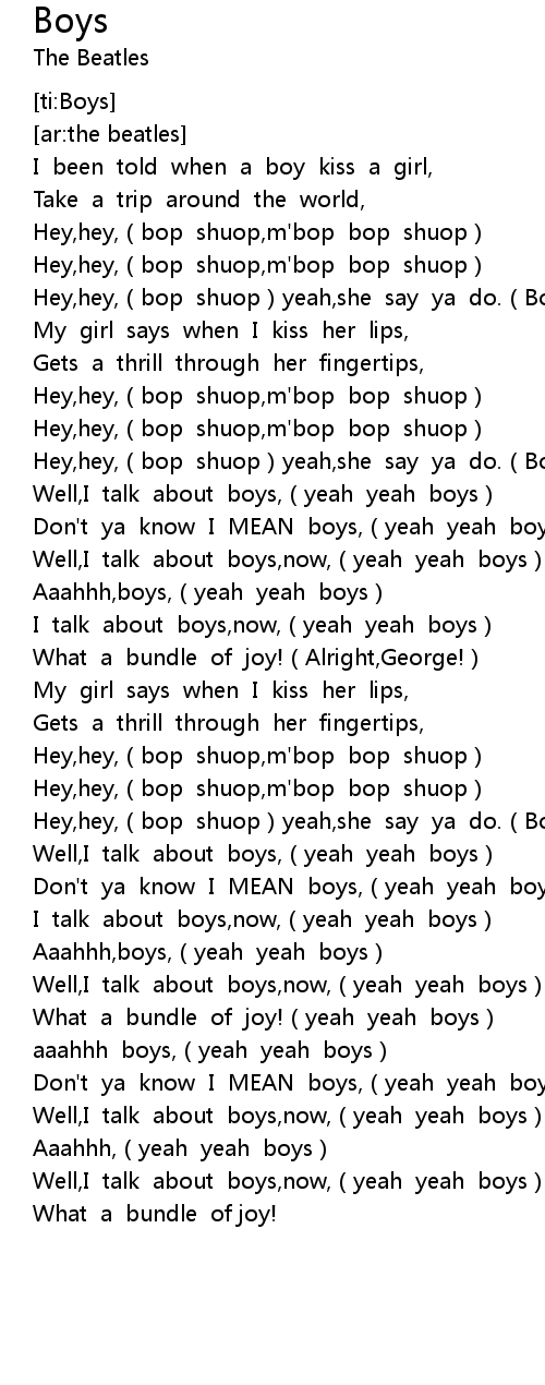 | [01:58.910] | Well, I talk about boys, now, yeah yeah boys |