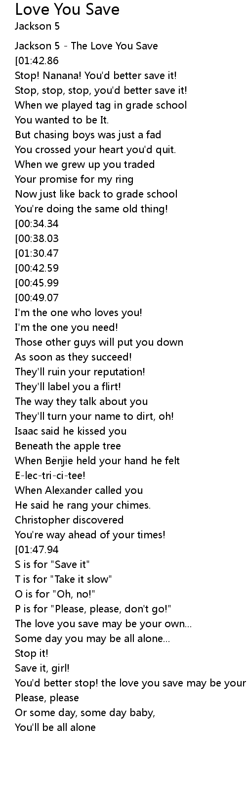 | [01:33.57][00:42.59] | You'd better stop the love you save may be your own! |