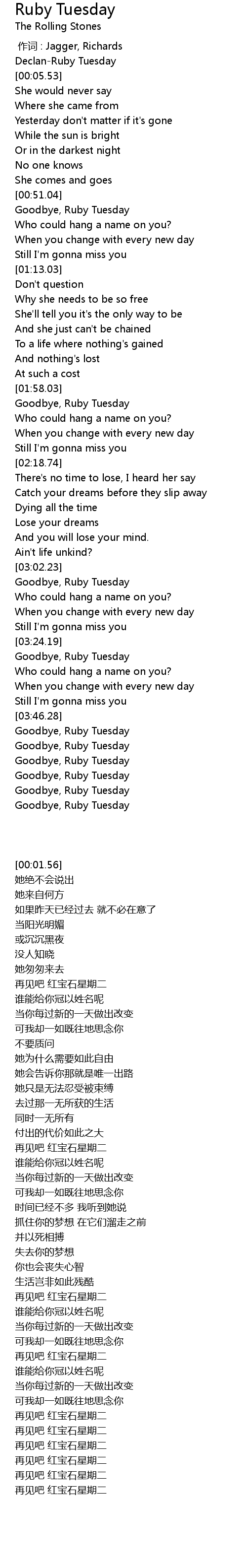 | [00:54.16] | Goodbye, Ruby Tuesday |