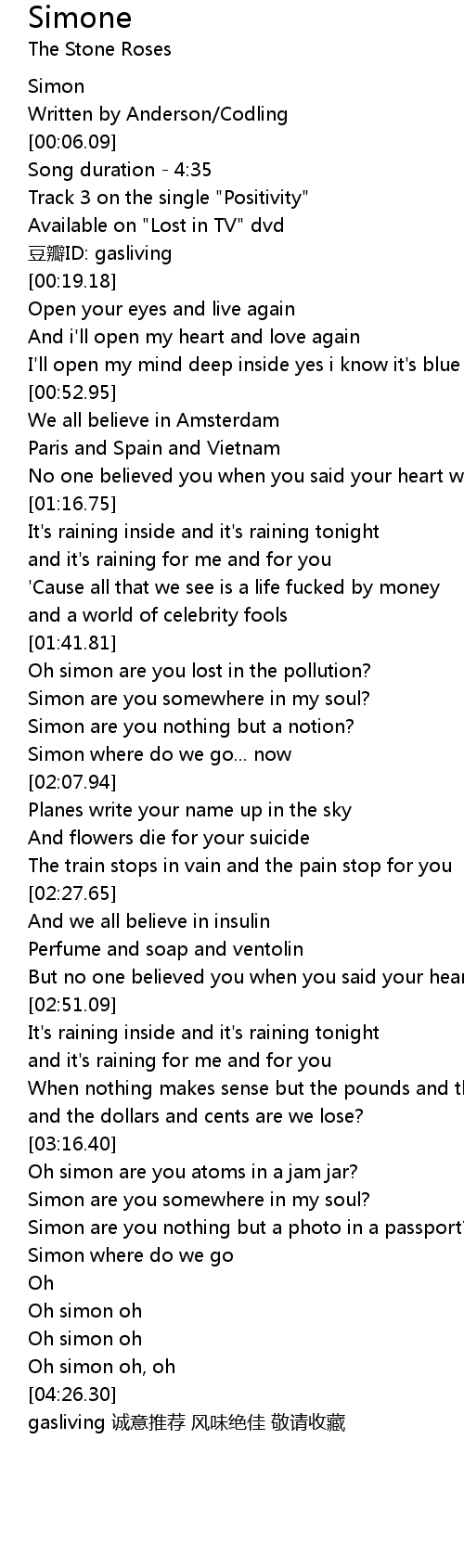 | [01:48.66] | Simon are you somewhere in my soul? |