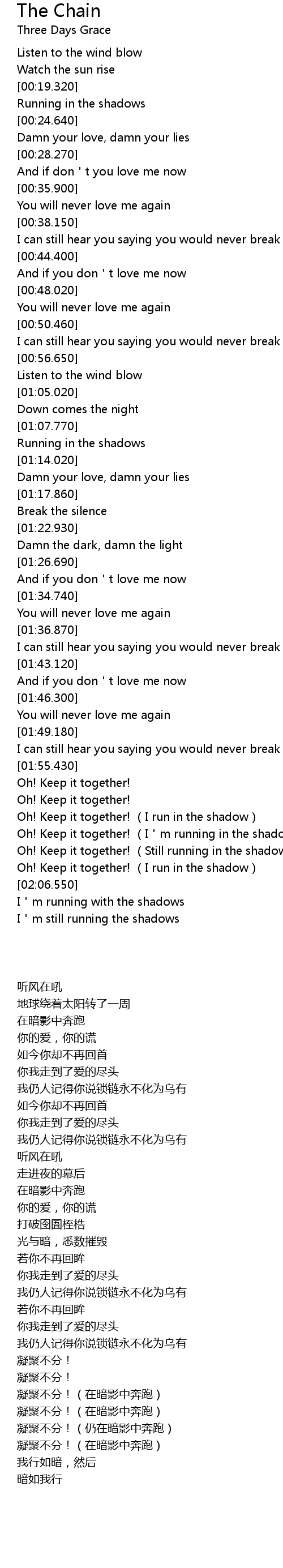 | [01:38.430] | I can still hear you saying you would never break the chain |