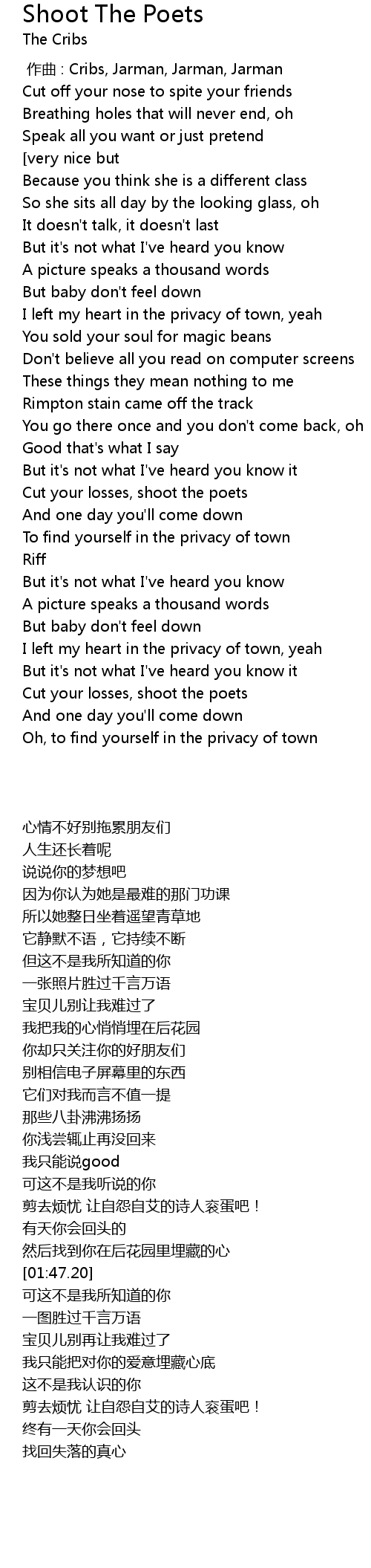 | [01:32.70] | Cut your losses, shoot the poets |