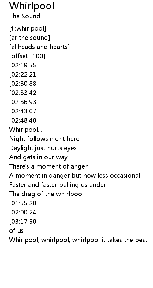 | [02:07.04][03:17.50][03:40.91] | Whirlpool, whirlpool, whirlpool it takes the best of us |