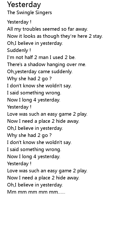 | [00:43.677] | Oh,yesterday came suddenly. |