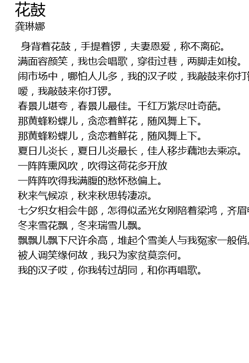 | 闹市场中,哪怕人儿多,我的汉子哎,我敲鼓来你打锣。 | |