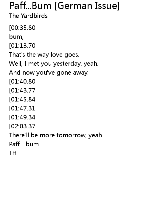 [00:30.05][00:35.80][00:43.58][00:50.52][01:11.87][01:18.71][01:54.28][02:01.23][02:08.30] Paff... bum,