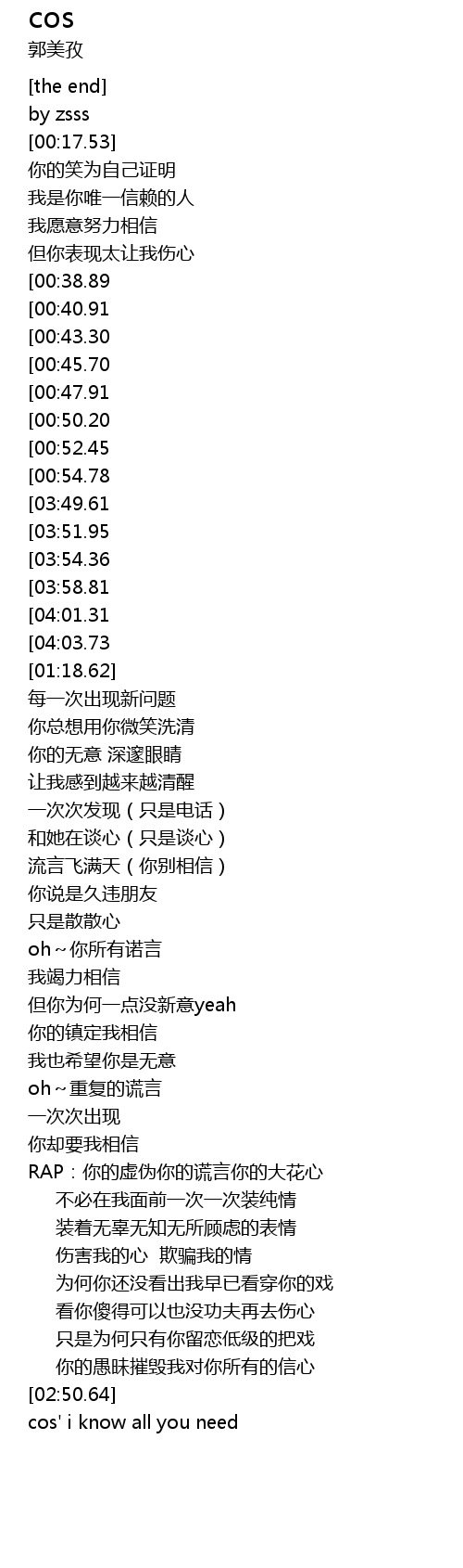 | [04:19.87][04:01.31][02:25.38][01:10.49] | cos' i know 再怀疑 |