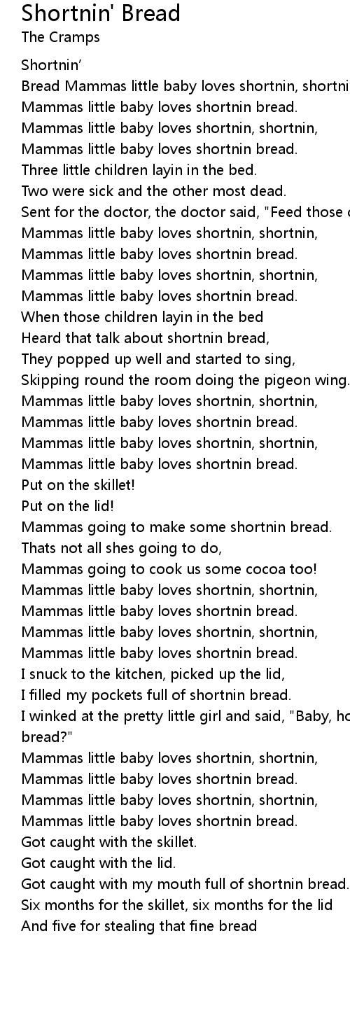 | Sent for the doctor, the doctor said, "Feed those children on shortnin bread." | |