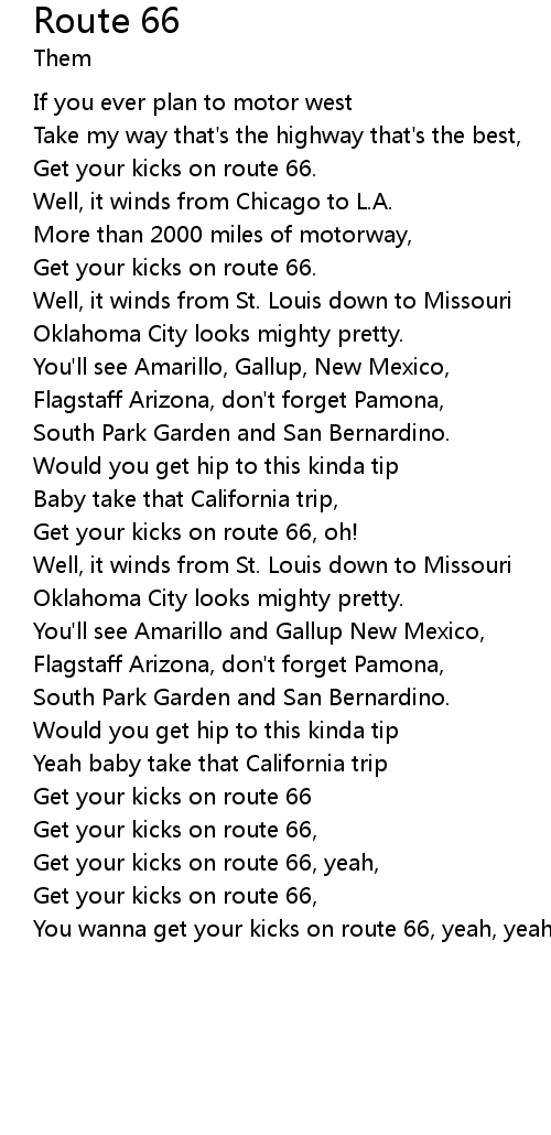 | You wanna get your kicks on route 66, yeah, yeah. |