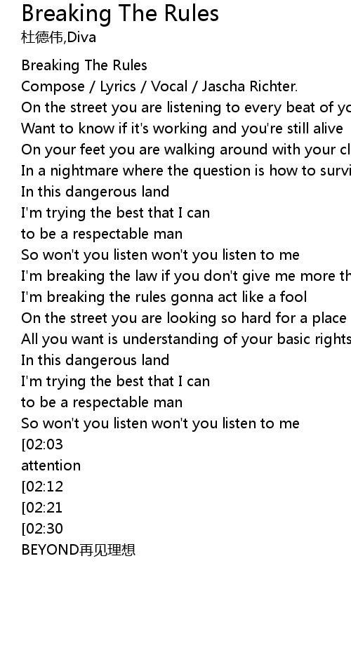 | [03:21][02:12] | I'm breaking the rules gonna act like a fool |