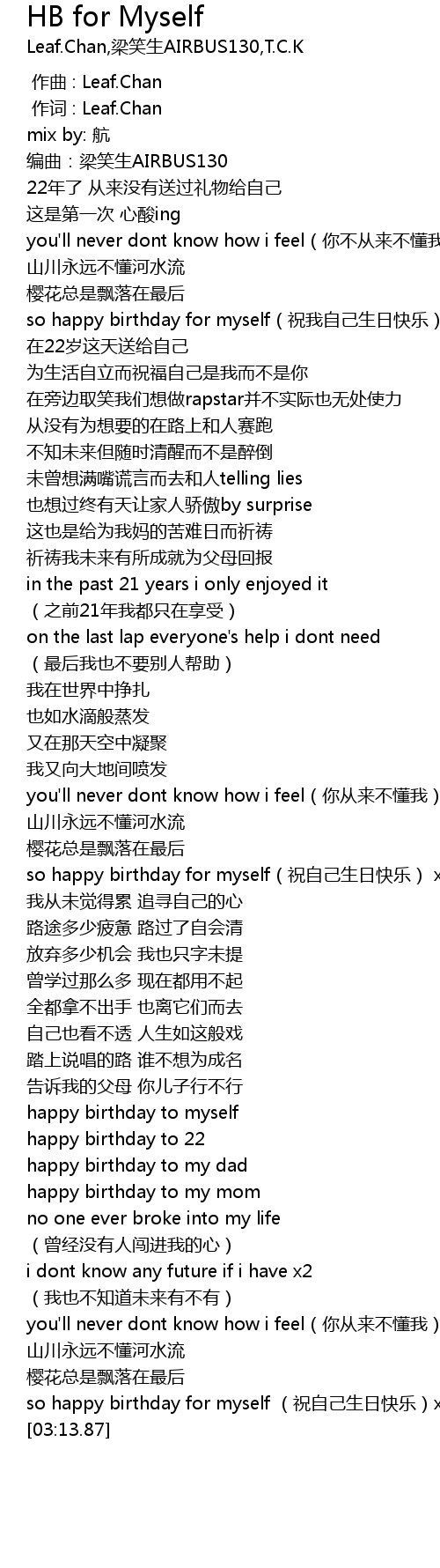 | [02:58.44] | so happy birthday for myself (祝自己生日快乐)x2 |