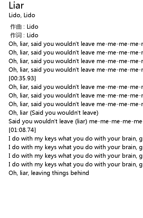 | [00:01.29] | Oh, liar, said you wouldn' t leave mememememememe |