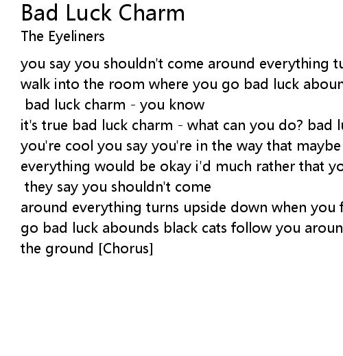 you say you shouldn't come around everything turns upside down when you first walk into the room where you go bad luck abounds black cats follow you around broken mirrors lie shattered on the ground [Chorus] bad luck charm - you know it's true bad luck charm - what can you do? bad luck charm - you know i think you're cool you say you're in the way that maybe you should stay away and then everything would be okay i'd much rather that you'd stay and hang out with me everyday i wouldn't have it any other way [Chorus] they say you shouldn't come around everything turns upside down when you first walk into the room where you go bad luck abounds black cats follow you around broken mirrors lie shattered on the ground [Chorus] |