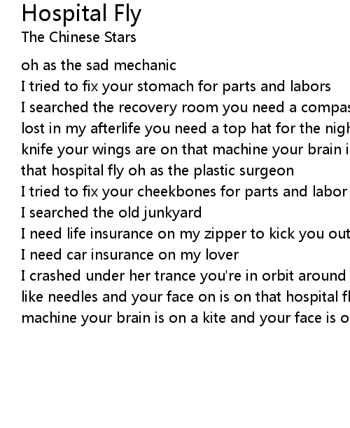 I crashed under her trance you're in orbit around my dreams your breath smells like needles and your face on is on that hospital fly your wings are on that machine your brain is on a kite and your face is on that hospital fly |