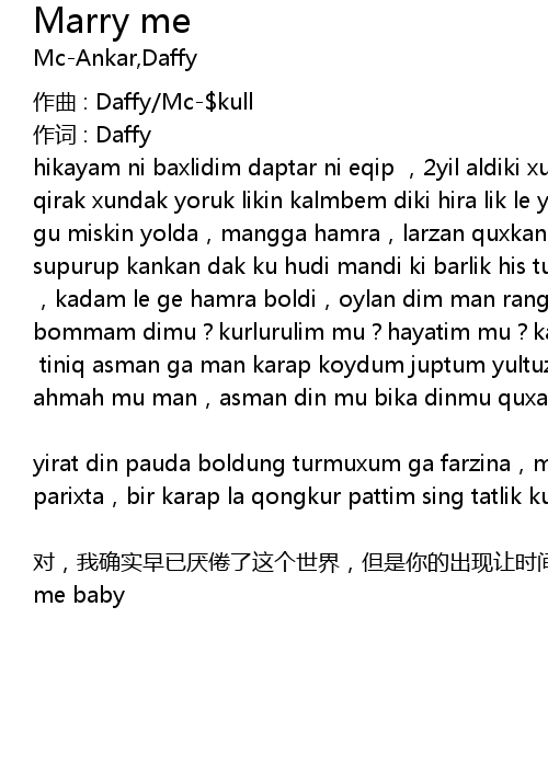 duì, wǒ què shí zǎo yǐ yàn juàn le zhè gè shì jiè, dàn shì nǐ de chū xiàn ràng shí jiān lǐ chōng mǎn le farzina, jiù zhè yàng jiē zhe xiě, wǒ mǎn nǎo huí xiǎng zhe yí gè shēng yīn wèi nǐ dài shang jié hūn zuàn jiè, 3 nián de shí jiān yě xǔ bìng bù tài zhǎng, nǐ wǒ zài yì qǐ de xǐ nù āi yuè tián mì yě yǒu gǎn shāng, wǒ yǒu shí ràng nǐ liú lèi, nǐ yǒu shí ràng wǒ gǎn dào fēng kuáng, dàn shì fēn bù kāi de rú jiāo sì qī zhǐ yǒu nǐ wǒ fēn xiǎng, wǒ pí qì bào wǒ zhī dào, wǒ bù gòu hǎo wǒ zhī dào, ér nǐ zǒng shì miàn dài wēi xiào duì wǒ bù lí bù qì wǒ yě zhī dào, zhǐ yǒu nǐ de pí qì cái néng ràng wǒ shén hún diān dǎo, jīng huāng shī cuò de bù zhī rú hé shì hǎo, qiān yán wàn yǔ dōu yǐ jīng wèi nǐ biàn de wú lì, bù guǎn shàng tiān rú hé kǎo yàn wǒ bǎ tā gū lì, xiē sī dǐ lǐ dōu huì dàn qù, zhǐ shèng xià ài nǐ, jiù zài jīn wǎn cǐ shí cǐ kè marry me baby