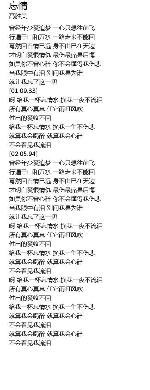 | [01:09.99] | 啊 给我一杯忘情水 换我一夜不流泪 |