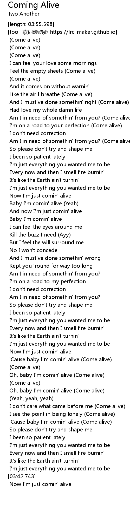 | [02:53.450] | Oh, baby I'm comin' alive (Come alive) |
