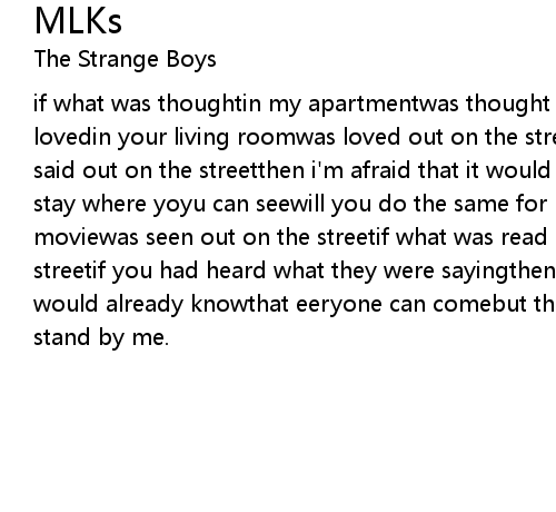 if what was thoughtin my apartmentwas thought out on the streetif what was lovedin your living roomwas loved out on the streetif what was saidin my bedwas said out on the streetthen i'm afraid that it would beonly you and meso i'll stay where yoyu can seewill you do the same for meif what was seen in the moviewas seen out on the streetif what was read in the bookwas read out on the streetif you had heard what they were sayingthen martin luther kingsthen you would already knowthat eeryone can comebut that i want to sit by youdo you wanna stand by me.