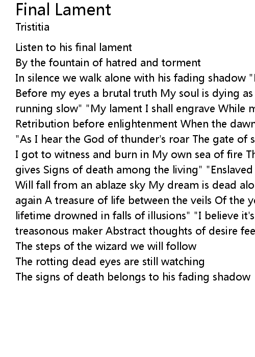 In silence we walk alone with his fading shadow "My eyes are bleeding as I bow Before my eyes a brutal truth My soul is dying as I watch the sands Of time running slow" "My lament I shall engrave While my eyes still are bleeding, Retribution before enlightenment When the dawn's deluge suffocates my darkness" "As I hear the God of thunder's roar The gate of sin awaits before me But first I got to witness and burn in My own sea of fire The rottings angel's dead eyes gives Signs of death among the living" "Enslaved by hate, no words of wisdom Will fall from an ablaze sky My dream is dead along with my hope And I die once again A treasure of life between the veils Of the yearning mermaid A dreaming lifetime drowned in falls of illusions" "I believe it's time to meet my treasonous maker Abstract thoughts of desire feed our pain" |