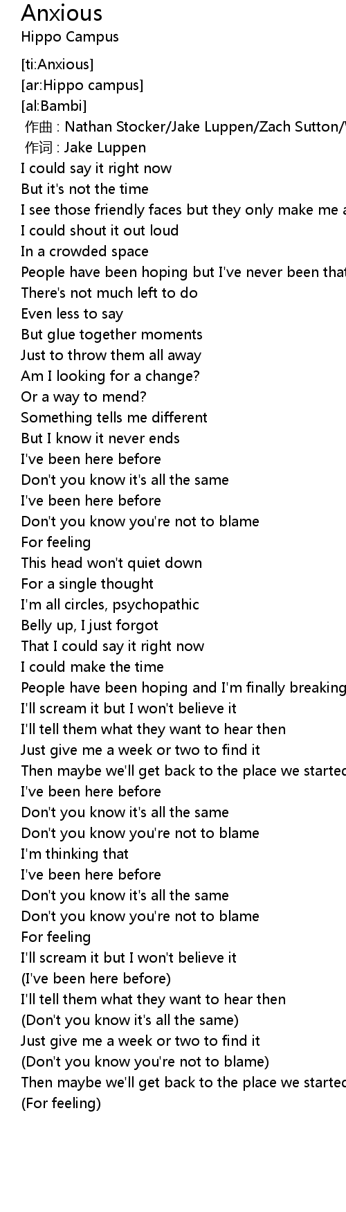 | [00:05.590] | I see those friendly faces but they only make me anxious |