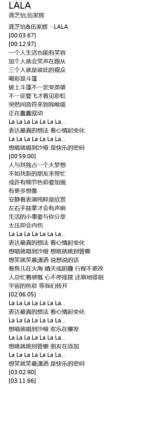 | [00:00.00] | 龚芝怡&伍家辉 - LALA |