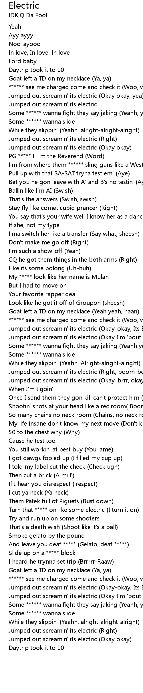 | [00:19.39] | Jumped out screamin' its electric (Okay okay, yea) |