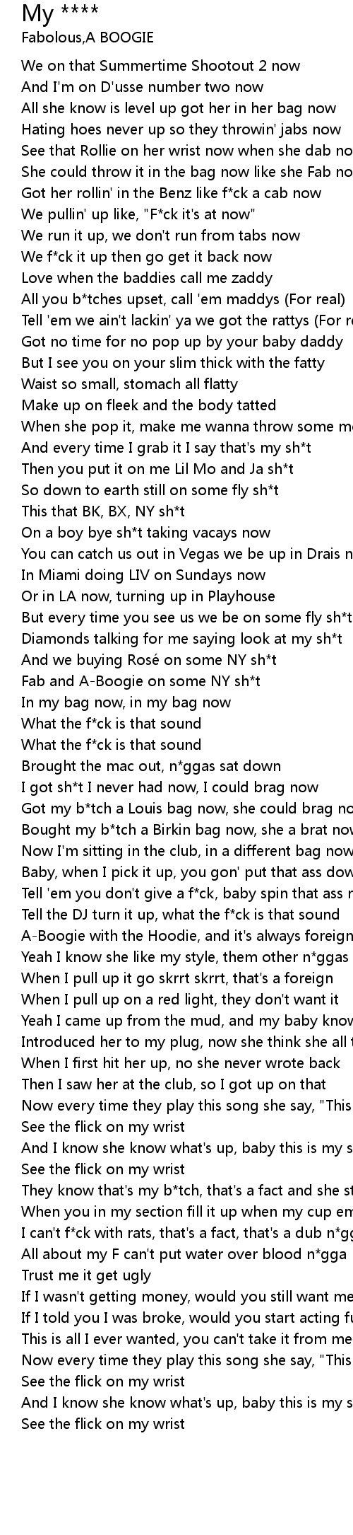 | [02:38.602] | Now every time they play this song she say, "This is my sh*t" |
