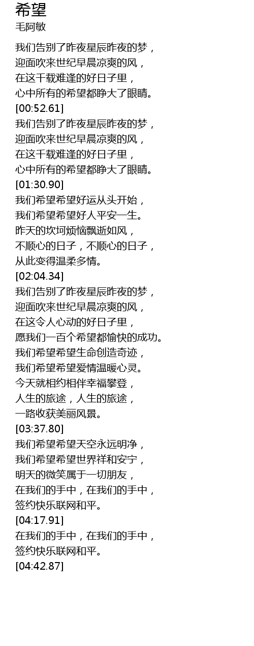| [03:52.81] | 我们希望希望世界祥和安宁, |