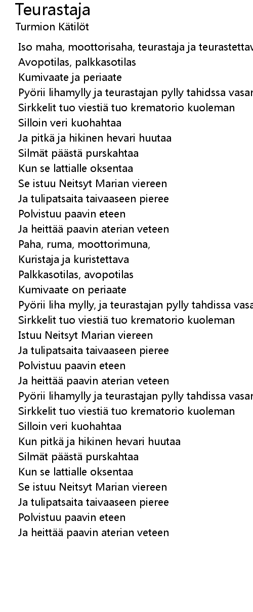 | [01:06.581] | Sirkkelit tuo viestiä tuo krematorio kuoleman |