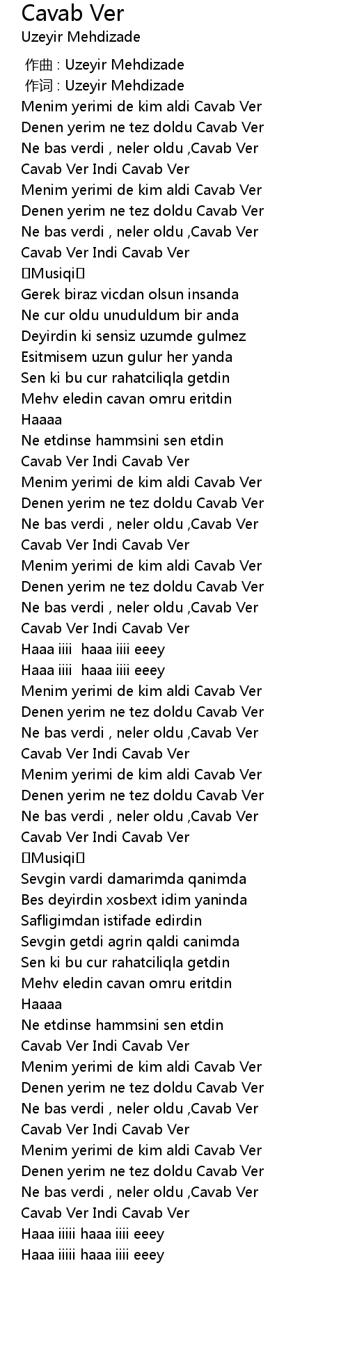 | [03:38.210] | Ne bas verdi , neler oldu ,Cavab Ver |
