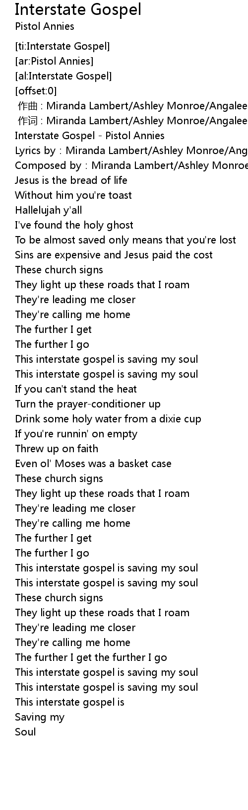 | [00:00.87] | Interstate Gospel - Pistol Annies |