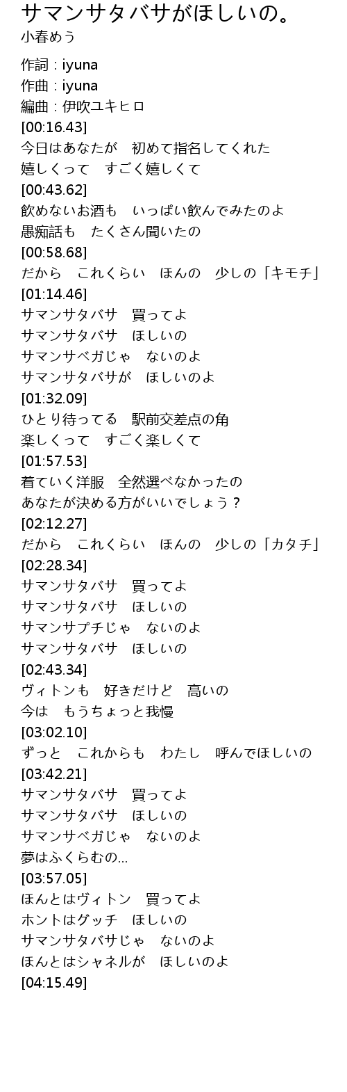 | [02:28.72] | サマンサタバサ 買ってよ |