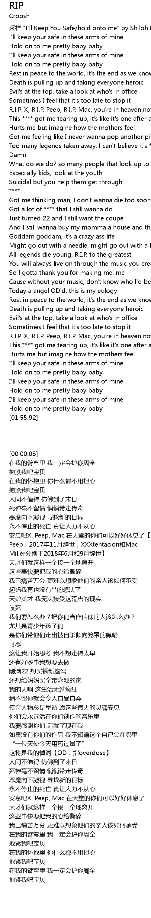 | [00:24.97] | R. I. P. X, R. I. P. Peep, R. I. P. Mac, you' re in heaven now relax |