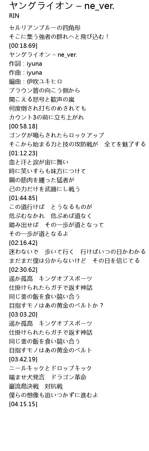 | [00:21.17] | ヤングライオン – ne_ver. |