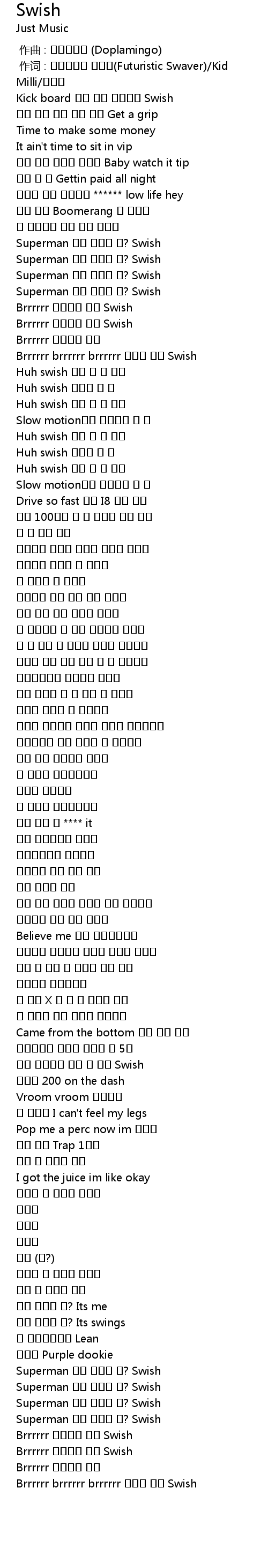 | [00:49.10] | Brrrrrr brrrrrr brrrrrr 존나게 빨라 Swish |