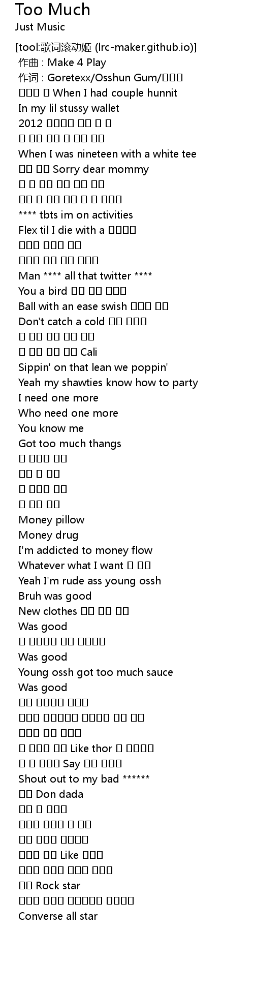 | [00:01.000] | 作词 : Goretexx/Osshun Gum/한요한 |