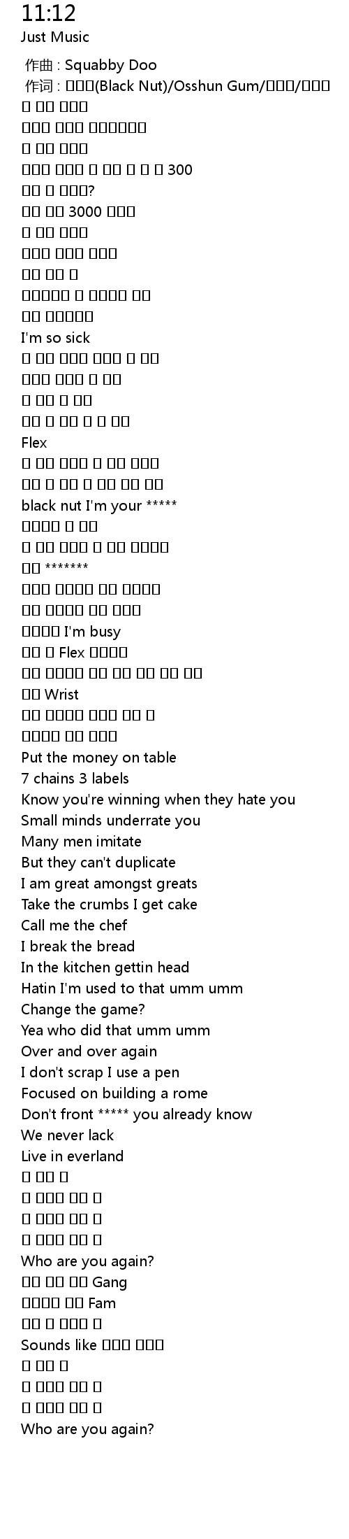 | [00:01.000] | 作词 : 블랙넛(Black Nut)/Osshun Gum/한요한/스윙스 |