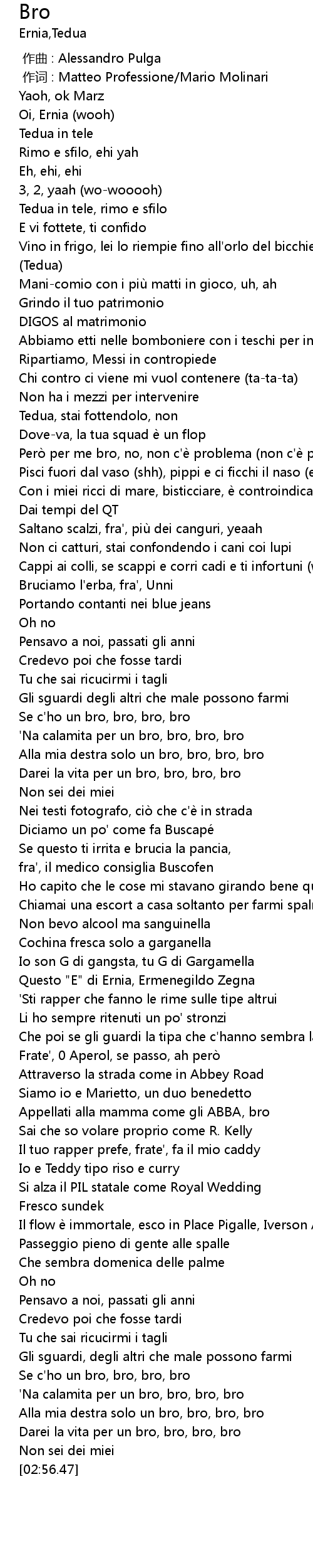 | [02:40.72] | Se c' ho un bro, bro, bro, bro |