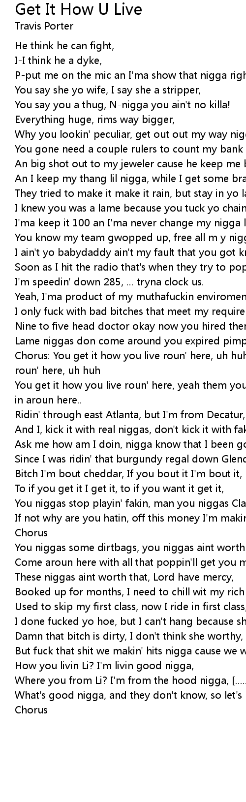 Chorus: You get it how you live roun' here, uh huh, You get it how you live roun' here, uh huh |