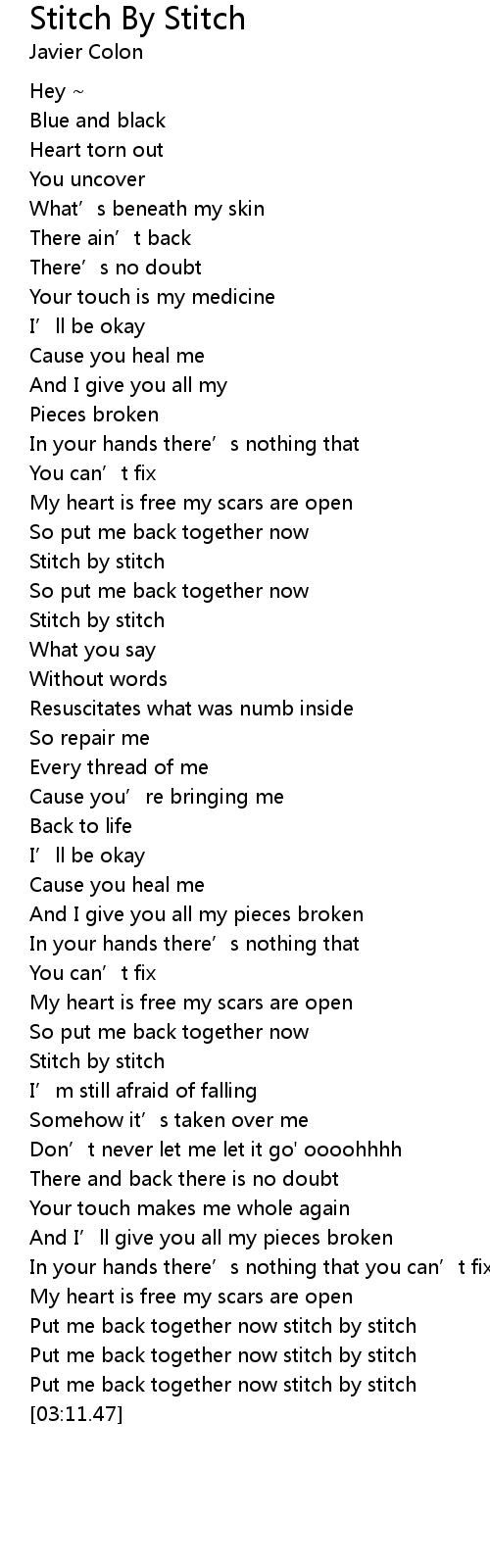 | [02:54.00] | Put me back together now stitch by stitch |