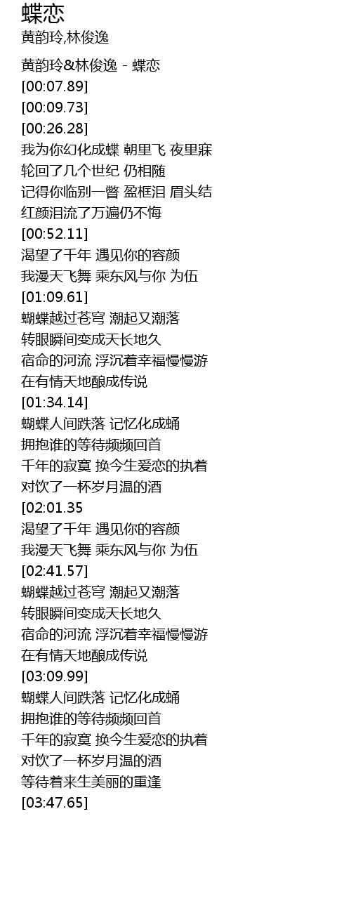| [00:01.12] | 黄韵玲&林俊逸 - 蝶恋 |