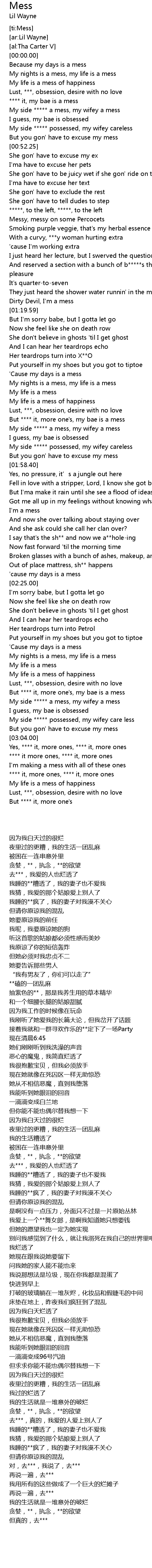 | [02:51.45] | My side ***** a mess, my wifey a mess |