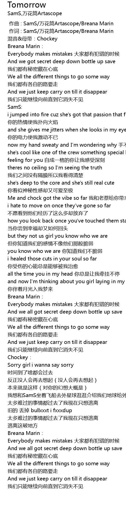 | [00:01.000] | 作词 : SamS/万花筒Artascope/Breana Marin |