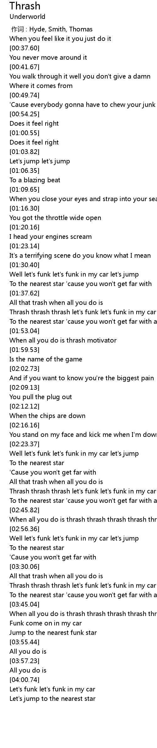 | [02:34.57] | Thrash thrash thrash let's funk let's funk in my car let's jump |