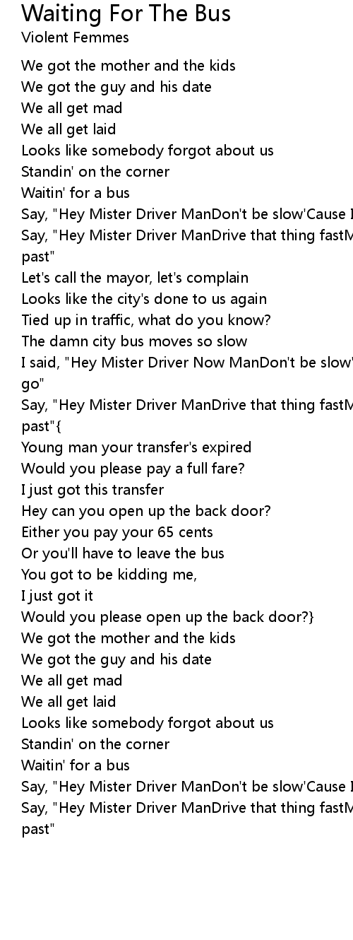 Say, "Hey Mister Driver ManDon't be slow'Cause I got somewhere I got to go" |