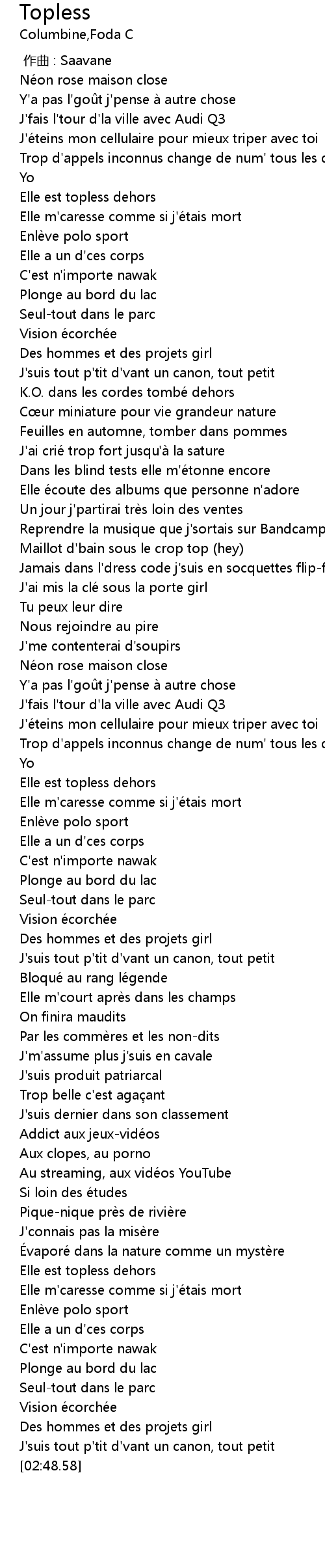 | [02:30.65] | Elle est topless dehors |
