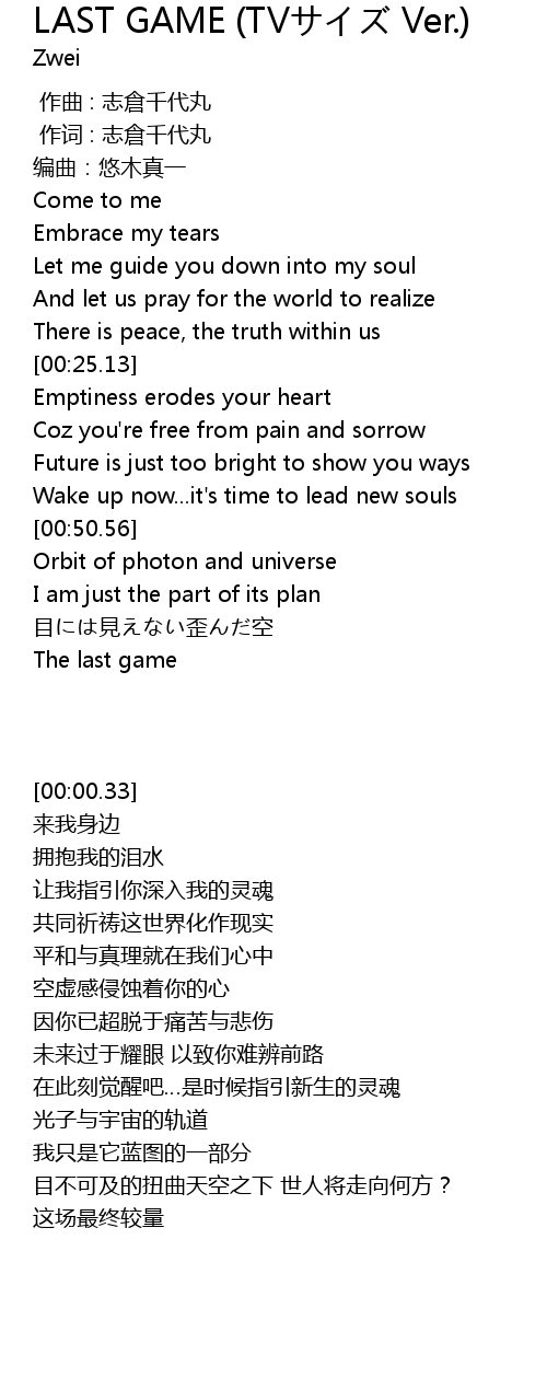 | [01:03.99]目には見えない歪んだ空 人は何処へと歩いていくの?[01:18.87] | The last game |