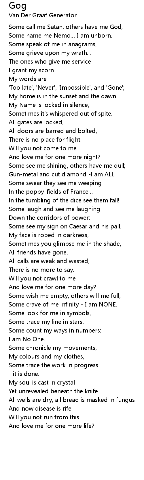 | 'Too late', 'Never', 'Impossible', and 'Gone'; | |